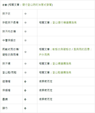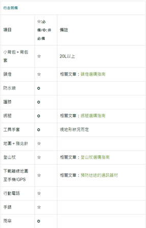 雖然標準健行(或是登山)裝備在網路上一下就查到了,不過在這邊還是稍微告知一下各位: